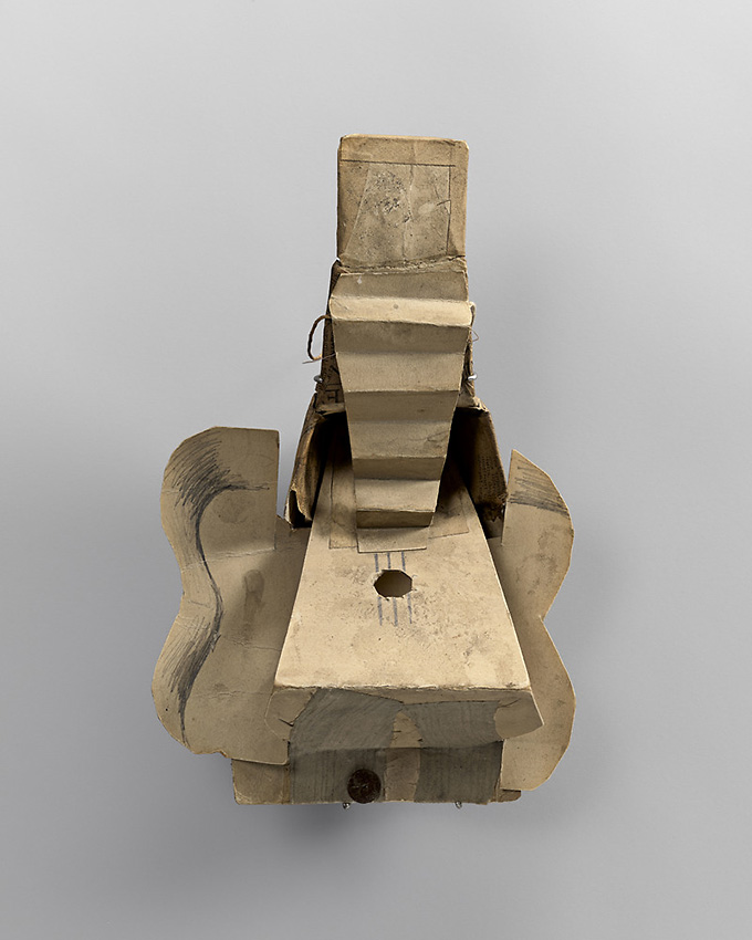 Guitare, Pablo Picasso, 1912, 22 x 14,5 x 7 cm, construction : carton découpé, papier collé, toile, ficelle, huile et traits de crayon [Musée national Picasso-Paris]