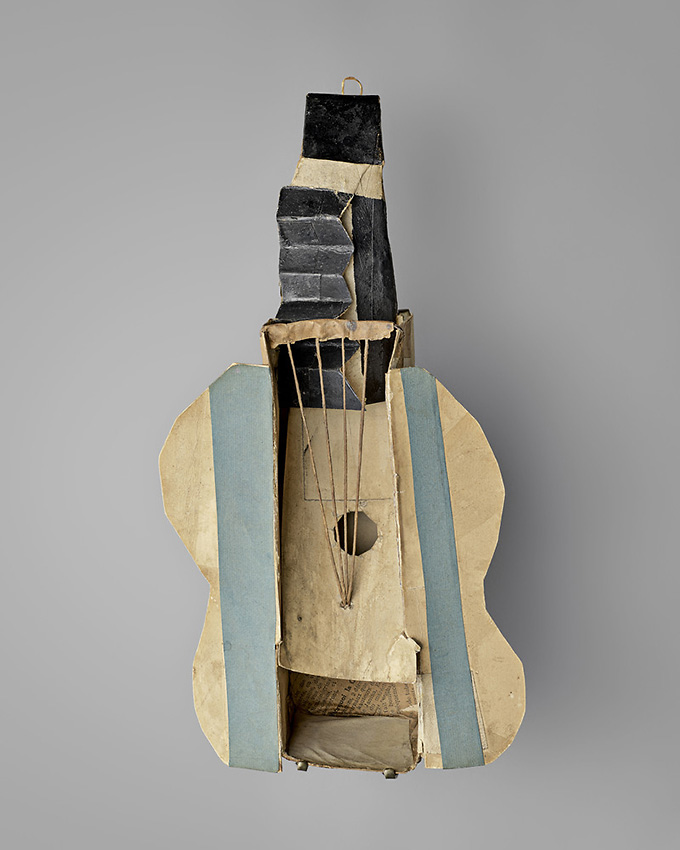 Guitare, Pablo Picasso, 1912, 33 x 18 x 9,5 cm, construction : carton découpé, papier collé, toile, ficelle, huile et traits de crayon [Musée national Picasso-Paris]